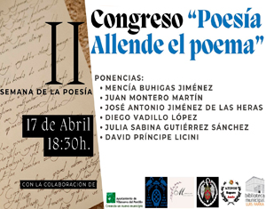 Ponencias en torno a la poesíaBiblioteca Municipal Luis Parra. A las 18.30 horas. Jóvenes/Adultos. Organiza Concejalía de Cultura, Biblioteca Municipal y Asociación Memorare. Participa IES Sapere Aude. Comienzo de la II Semana de la Poesía en el municipio... |