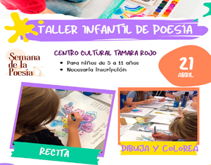 Aprende poemas pintando Centro Cultural Tamara Rojo. A las 17.30 horas. Niños/as de 5 a 11 años, sin acompañantes. Inscripciones a partir del 13 de abril en el Centro Cultural. Celebramos la II Semana de la Poesía con un taller para los más pequeños.... |